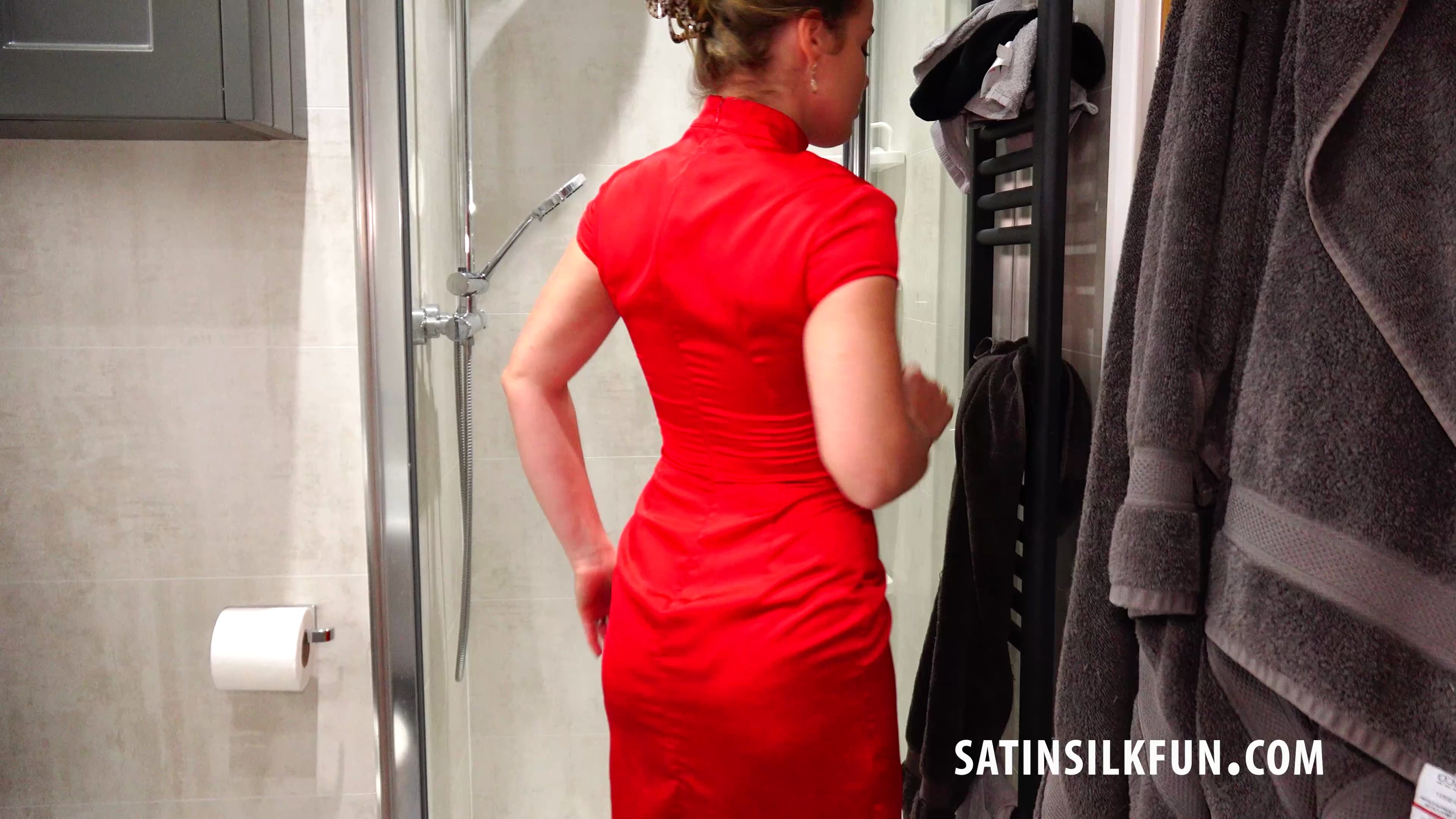 Brunettes, Shower Setting, Bare Legs, Satin Dress, Red Satin, Shiny Satin, Red Panties, Satin Panties, Wet and Messy, Wet Look, Wet Satin