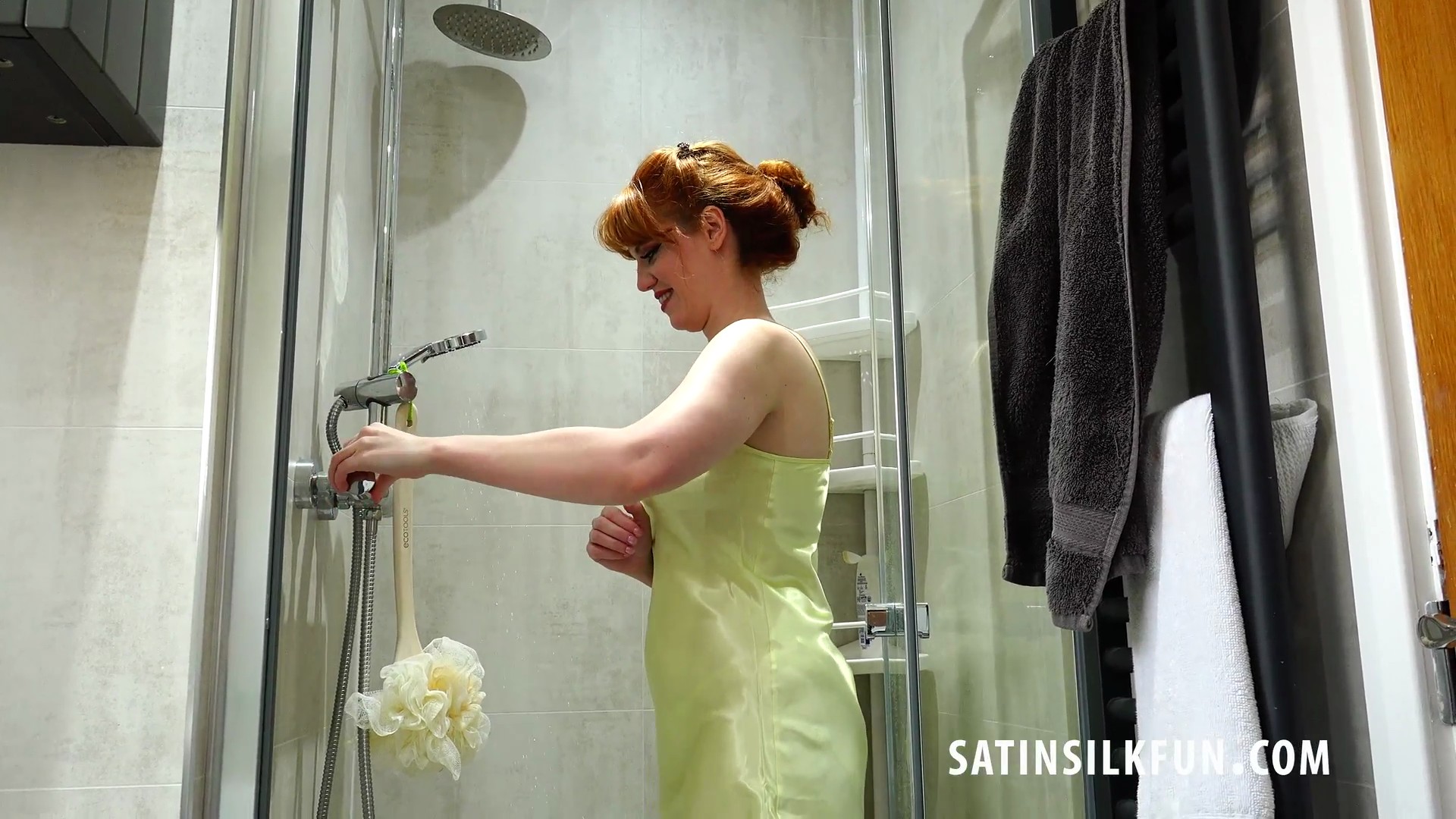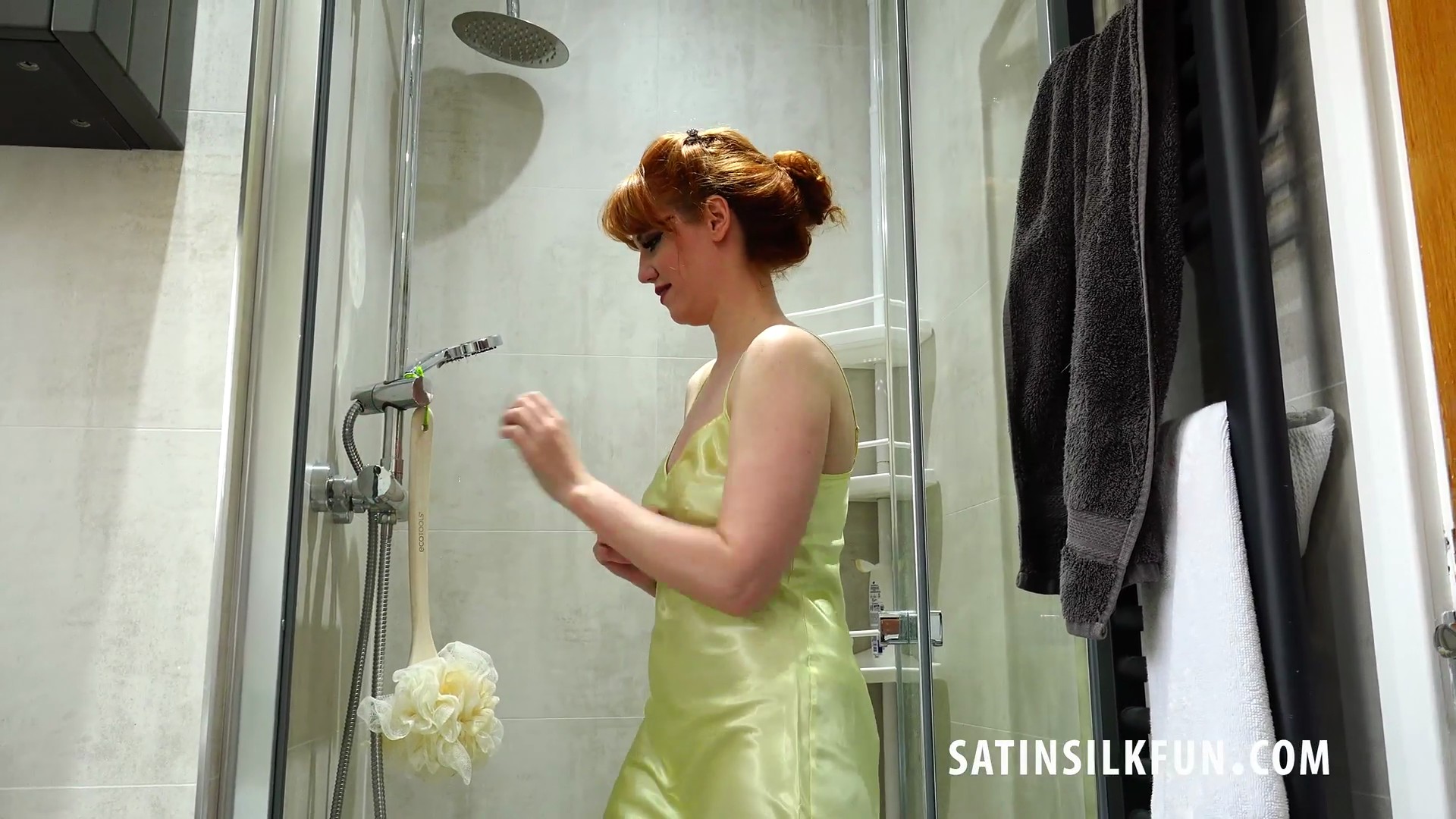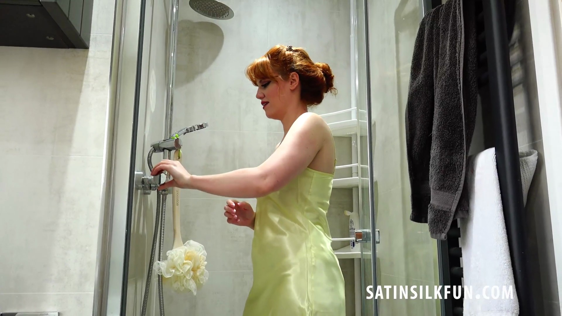 Redheads, Shower Setting, Bare Legs, Satin Chemise, Yellow Chemise, Shiny Satin, Yellow Panties, Satin Panties, Wet and Messy, Wet Look, Wet Satin