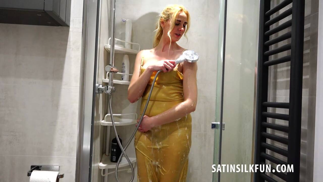 4K, Blondes, Shower Setting, Bare Legs, Satin Dress, Golden Chemise, Shiny Satin, Yellow Panties, Nylon Panties, Wet and Messy, Wet Look, Wet Satin